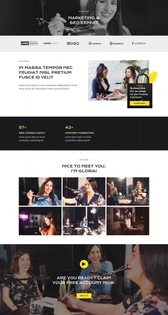 About My Story Marketing & SEO expert My Story In massa tempor nec feugiat nisl pretium fusce id velit Lorem ipsum dolor sit amet, consectetur adipiscing elit. Ut elit tellus, luctus nec ullamcorper mattis, pulvinar dapibu. Podcast WELCOME TO THE GLORIA OLIVER AUDIO EXPERIENCE 57+ SEO Consultancy Lorem ipsum dolor sit amet, consectetur adipiscing elit. 42+ Content Marketing Lorem ipsum dolor sit amet, consectetur adipiscing elit. Client Satisfaction 96% Creativity 92% Project Delivery 88% Gallery Nice to meet you. I'm Gloria! Are you ready? Claim your free account now. Sign Up